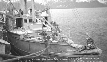 | Keywords: Mail steamer DORA after having passed through eruption of Katmai Volcano near Kodiak Island, 1912 (THWAITES 178).jpeg check categories 27 October 2016 1 Photograph Creator John E Thwaites The 1912 eruption of Katmai was the largest in North America in this century 46 000 square miles of the surrounding area was covered in greater than 0 40 inch 1 cm of ash Caption on image SS Dora after having passed through volcanic eruption near Kodiak Island June 1912 PH Coll 247 303 Subjects LCTGM Dora Ship ; Katmai Mount Alaska --Eruption 1912; Volcanoes--Alaska; Shelikof Strait Alaska ; Piers wharves--Alaska Subjects LCSH Volcanic ash tuff etc --Alaska--Shelikof Strait depicted place Alaska 1912 Institution University of Washington UWASH-THWAITES-source accession number thwaites 178 PD-old-auto-1923 1940 Information field Order Number THW154 Images from the John E Thwaites Photographs of Alaska Collection to check Volcanoes of Alaska |