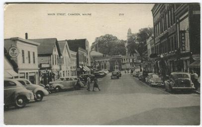 Keywords: postcards camden main street mainstreet businesses the smiling cow thesmilingcow camden national bank camdennationalbank crockett's five and ten crockettsfiveandten automobiles people A view of Main Street in Camden, Maine, likely during the 1940's. The Smiling Cow gift shop can be seen on the left. The Camden National Bank and Crockett's 5 and 10 are in the middle background. Cars line the street on both sides. Pedestrians are visible in the street and on the sidewalks. A view of Main Street in Camden, Maine, likely during the 1940's. The Smiling Cow gift shop can be seen on the left. The Camden National Bank and Crockett's 5 and 10 are in the middle background. Cars line the street on both sides. Pedestrians are visible in the street and on the sidewalks. |