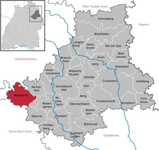 | Keywords: Mainhardt in SHA.svg DeLocMaps Mainhardt Landkreis Schwäbisch-Hall District of Schwäbisch-Hall L'arrondissement de Schwäbisch-Hall Arrondissement de Schwäbisch-Hall Baden-Württemberg Bade-Wurtemberg Baden-Württemberg Adobe Illustrator <br/> own based on <br/> File Municipalities in Baden-Württemberg svg by TUBS<br/> File Baden-Württemberg HD district svg by TUBS 2010-05-18 Hagar66 based on work of TUBS Hagar66/licensesection Attribution TUBS/Credits Locator maps of municipalities in Landkreis Schwäbisch-Hall Mainhardt |