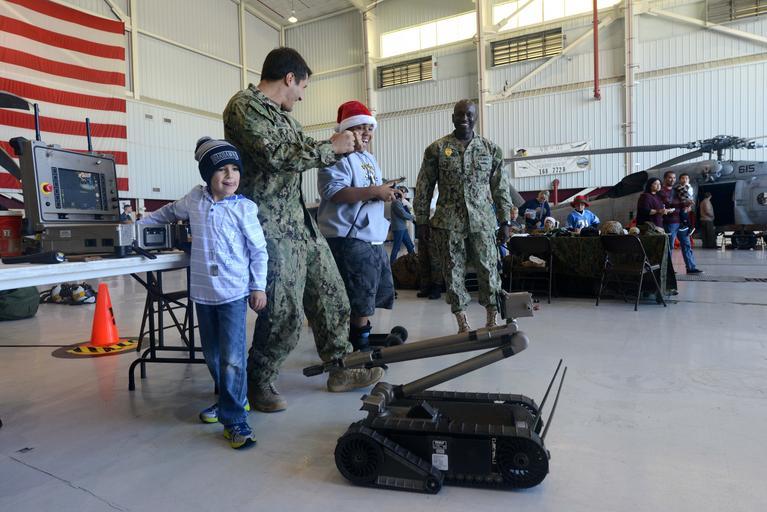 | Keywords: Make-A-Wish Foundation's Holiday Salute 131207-N-FN215-099.jpg en Sailors assigned to Explosive Ordnance Disposal Expeditionary Support Unit EODESU 1 shows kids how to operate a bomb disposal robot during a Holiday Salute from the San Diego Chapter of the Make-A-Wish Foundation held on board Naval Air Station North Island The annual event gives seriously ill children and their families an opportunity to interact with service members from the Navy and Coast Guard while celebrating the holiday season U S Navy photo by Mass Communication Specialist 2nd Class Joshua Scott/Released 2013-12-07 Petty Officer 2nd Class Joshua Scott https //www dvidshub net/image/1068584 131207-N-FN215-099 2013-12-09 14 40 SAN DIEGO CA US PD-USGov-Military-Navy Naval Air Station North Island in the 2010s Images from DoD uploaded by Fæ |