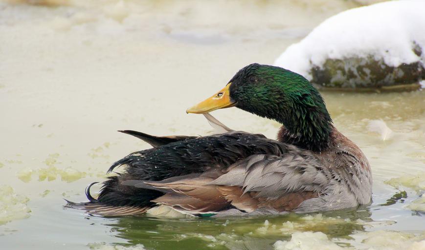 Keywords: mallard male drake plumage colorful swim bill water snow wash nature artificial duck pond