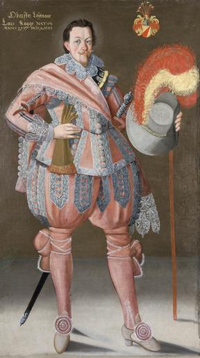 | Keywords: Målning. Porträtt. Officersvän. Lars kagge - Skoklosters slott - 87193.tif Lars Kagg greve riksmarsk plain text Helfigur stående fas höger Höger hand i sidan håller handskar vänster hand håller plymagerad hatt och käpp Röd dräkt med silvergaloner värja <br/>Inskrift överst t v Oberster leiltnant Lars Kagge NATVS ANNO 1597 FECIT Ao 1623 <br/>I övre högra hörnet vapensköld med stråle original caption Målning Porträtt Officersvän Lars kagge SKO 2264<br/> Nyckelord Herrmode 1600-tal Kagge Lars Pösbyxor Skorosor Rosa Barocken Målning Porträtt Föremålsbild Man Stormaktstiden 1623 oil on canvas size mm 1120 1980 SKO Herman Wrangel riksråd fältmarskalk place of origin original filename sm_dig4832_2264 23522 inventory number SKO 2264 87193 PD Jens Mohr Jens Mohr Georg Günther Kräill Portraits in the Skokloster Castle 1620s paintings in Sweden 1623 portrait paintings Male 17th-century men of Sweden 1623 17th-century portrait paintings in Sweden 1623 17th-century portrait paintings of men at full length 1623 17th-century portraits with coat of arms 1623 Accessories for shoes Baroque paintings Field Marshals of Sweden Male clothing Male portraits holding glove 1623 Male shoes in portrait paintings 1623 Nobility of Sweden 1623 Pink Portrait paintings of men with swords 1623 Sweden 1611-1718 Media contributed by LSH unmatched creator Media contributed by LSH unmatched keyword Media contributed by LSH 2013-10 |