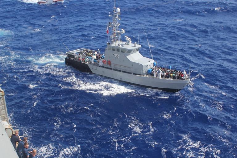 Keywords: Maltese patrol vessel P52 underway 2013.JPG en Distressed persons depart the U S Navy amphibious transport dock ship USS San Antonio LPD-17 after being transferred to Armed Forces of Malta offshore patrol vessel P52 San Antonio provided food water medical attention and temporary shelter to the rescued San Antonio rescued 128 men adrift in an inflatable raft after responding to a call by the Maltese Government 2013-10-17 131017-N-ZZ999-006 Navy http //www navy mil/view_image asp id 163397 U S Navy photo PD-USGov-Military-Navy P52 ship 2004 Refugees from Africa in Malta 2013 in Malta |