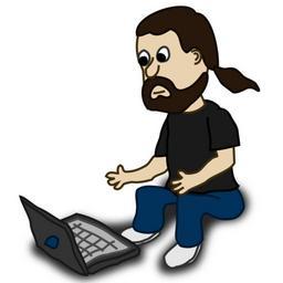 Keywords: man comic character ponytail beard laptop sitting casual male adult person computer