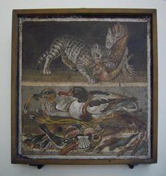 Keywords: MAN mosaici animali da Pompei 1040618.JPG Napoli Museo Archeologico Nazionale inv nr 9993 mosaico da Pompei Casa del Fauno Sono rappresentati su due registri sovrapposti quello superiore un gatto che agguanta un pollo; quello inferiore una natura morta che rappresenta tutto quello che i Romani amavano sulla loro tavola due anatre qui con boccioli di fiori di loto nel becco quattro uccelletti legati per le zampe conchiglie e frutti di mare pesci diversi Own Lalupa Other versions <gallery> File MAN mosaici animali da Pompei 1040618 JPG Museo Archeologico Naples File Mosaic cat ducks Massimo Inv124137 jpg Palazzo Massimo Rome File Vatican Museum mosaic 4 jpg Vatican Museum Vatican City </gallery> PD-old-100 self GFDL cc-by-sa-3 0 2 5 2 0 1 0 Mosaics from the House of the Faun Pompeii 9993 Mosaics of cats Mosaics of ducks Mosaics of birds Mosaics of shells Mosaics of fish Cats in ancient Roman mosaics Birds in ancient Roman mosaics |