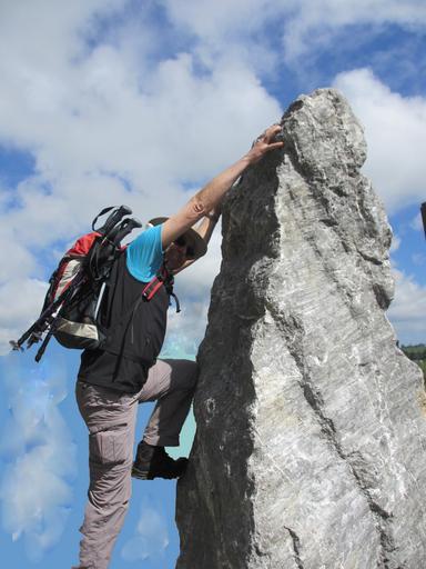 Keywords: man person climb mountaineer rock steep sky blue clouds