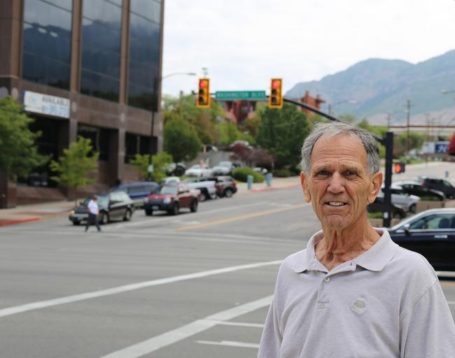 Keywords: man person old outside street traffic intersection outdoor city outdoors summer downtown face elderly senior aged