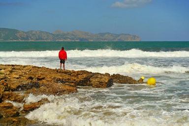 Keywords: man sea human coast landscape distant beach rock rocky coast lonely alone water wave mediterranean forward boje mallorca north coast balearic islands spain island holiday travel holidays outlook nature