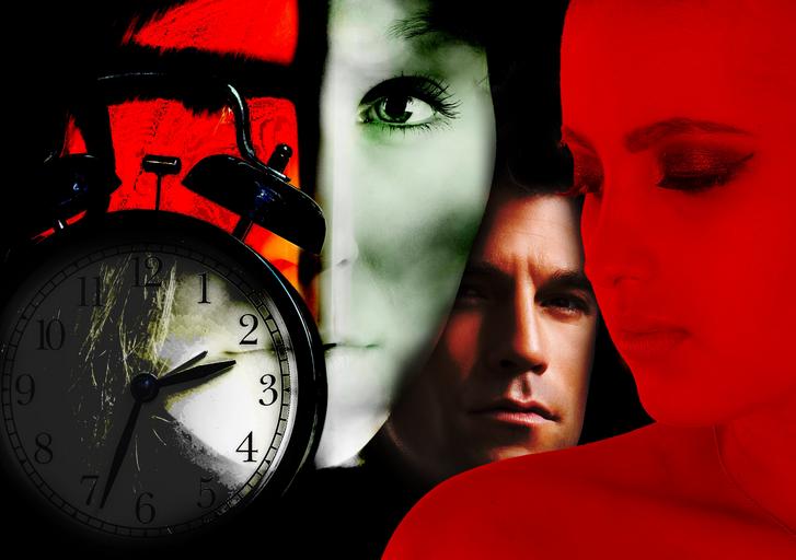 Keywords: man stylish woman women clock time joy threesomes love triangle menage a droite psychology fashion view fashionable face haircut human display dummy doll portrait profile hairstyle head group amount of time