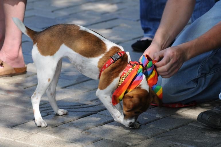 View Original:Man_tying_rainbow_bandana_on_dog_at_Gay_Pride_Parade.jpg (4288x2848)