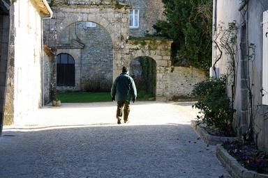 Keywords: man walking alley man between houses man in sunlight back stone buildings light and shade sunshine and shadow