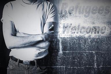 Keywords: man wall refugees welcome asylum human help human rights terrible experiences asylum seekers human dignity refugee crisis needy escape way out compassion security
