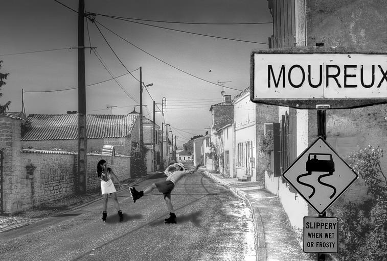 Keywords: man woman in love lovers fall in love rollerblading street pleasure moureux village