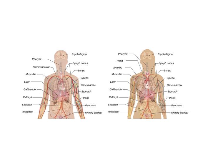 Keywords: man woman schema body anatomy teaching organs heart kidneys liver lung stomach head brain biology human science medical figure nursing caption present label