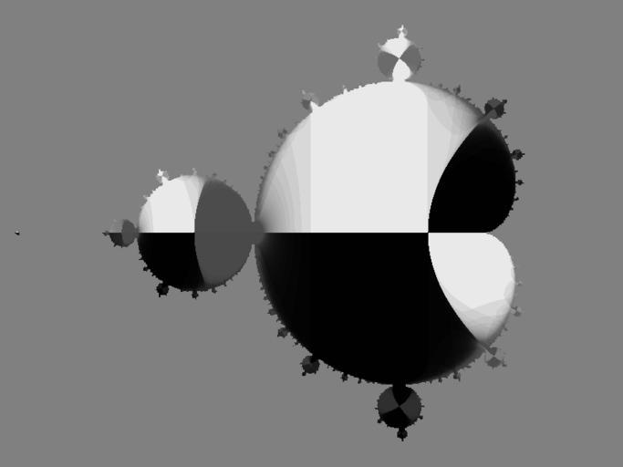 Keywords: Mandelbrot inside (64 iters B&W).gif Mandelbrot set a fractal Here it's inside is colourised from a special method named palette walk In this example the function uses 64 iterations and a palette of 128 colours It starts from palette index 64 Then in every iteration it tests for x y < 0 if true then it decreases the palette index by 1 else it will be incremented by 1 The method can also be used to colourise the outside the aura of the fractal If one uses two palettes then it can be combined with the normal colour-mapping method the count of iterations used as palette index A example of the combination method is the image Julia set C 0 285 0 01 II jpg See also thumb left Colour version Solkoll 2D Mandelbrot sets whole Mandelbrot set interior |