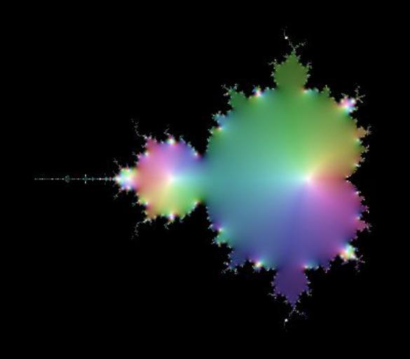 | Keywords: Mandelbrot-Iterate-16.jpg The diagram shows the part of the complex plane ranging from “2 2 to 1 on the real axis horizontal and from “1 4i to 1 4i on the imaginary axis vertical The color for a point <math>c</math> in the plane is the color coded value of the function <math>f \ n _c 0 \quad\text for n 16\quad\text and f_c z z 2+c</math> Note that the exponent refers to <math>f</math> as a function and not to its value i e <math>f</math> <math> n</math> denotes n-fold applying <math>f</math> <math>f \ n f\circ f\circ \cdots \circ f</math> So <math>f</math> <math> n</math> is an element of the sequence <math>\begin align f_c \ 0 z \ \; z \mapsto z\\ f_c \ 1 z \ \; z \mapsto z 2+c\\ f_c \ 2 z \ \; z \mapsto z 2+c 2+c\\ f_c \ 3 z \ \; z \mapsto z 2+c 2+c 2+c\\ \;\;\vdots \end align </math> For <math>n>0</math> the function <math>f_c n 0 </math> is a polynomial of degree <math>2 n-1 </math> in <math>c</math> Therefore it has <math>2 n-1 </math> zeros in the complex plane It turns out that all zeros are distinct Moreover the zeros are located in a disc around the origin whose diamater does not depend on <math>n</math> Das Diagramm zeigt einen Teil der komplexen Zahlen mit Realteil zwischen “2 2 to 1 horizontal und Imaginärteil zwischen “1 4i und 1 4i vertikal Die Farbe eines Punktes <math>c</math> der Ebene ist der farbcodierte Wert der Funktion <math>f \ n _c 0 \quad\text mit n 16\quad\text und f_c z z 2+c</math> Hierbei bezieht sich der Exponent auf <math>f</math> als Funktion und nicht auf deren Funktionswert d h <math>f</math> <math> n</math> steht fĂĽr die n-fache HintereinanderausfĂĽhrung von <math>f</math> <math>f \ n f\circ f\circ \cdots \circ f</math> Es ist <math>f</math> <math> n</math> also ein Glied der Folge <math>\begin align f_c \ 0 z \ \; z \mapsto z\\ f_c \ 1 z \ \; z \mapsto z 2+c\\ f_c \ 2 z \ \; z \mapsto z 2+c 2+c\\ f_c \ 3 z \ \; z \mapsto z 2+c 2+c 2+c\\ \;\;\vdots \end align </math> FĂĽr <math>n>0</math> ist die Funktion <math>f_c n 0 </math> ein Polynom vom Grade <math>2 n-1 </math> in <math>c</math> Somit hat die Funktion <math>2 n-1 </math> Nullstellen die alle verschieden sind Zudem liegen alle Nullstellen in einem Kreis dessen Größe unabhängig von <math>n</math> ist Self made using a throw-away C program 2008-03-24 Georg-Johann Lay Images of the sequence for n 1 20 0 cellpadding 1 cellspacing 1 - 110px thumb left 1 color map 110px thumb left 2 110px thumb left 3 110px thumb left 4 110px thumb left 5 - 110px thumb left 6 110px thumb left 7 110px thumb left 8 110px thumb left 9 110px thumb left 10 - 110px thumb left 11 110px thumb left 12 110px thumb left 13 110px thumb left 14 110px thumb left 15 - 110px thumb left 16 110px thumb left 17 110px thumb left 18 110px thumb left 19 110px thumb left 20 From step to step the number of zeros white is doubling The zeros are chaotically scattered around in a disc whose diameter does not depend on <math>n</math> For values of <math>c</math> that belong the the Mandelbrot set <math>M</math> the sequence <math>f 1_c 0 \; f 2_c 0 \; f 3_c 0 \ \ldots </math> is bounded For values not in <math>M</math> the sequence tends to infinity black Values of <math>c</math> located in the body of <math>M</math> ” the big cardioid ” lead to sequences that converge to a definite complex number In other words these values converge to a cycle of period 1 Values in the head of <math>M</math> ” the big circle at the left of the body ” tend to periodoc cycles of period 2 This can be seen in the sequence of images because the head changes its color from bright to dark and vice versa from step to step Values located in the small bulbs ” the hands symetrically arranged to the body ” tend to periodic cycles of period 3 and so on Von Schritt zu Schritt verdoppelt sich die Anzahl der Nullstellen weiĂź Die Nullstellen sind chaotisch verstreut in einem begrenzten Gebiet dessen Größe nicht von <math>n</math> abhängt FĂĽr Werte <math>c</math> in der Mandelbrot-Mengem <math>M</math> sind die Folgen <math>f 1_c 0 \; f 2_c 0 \; f 3_c 0 \ \ldots </math> beschränkt FĂĽr Werte ausserhalb von <math>M</math> streben die Folgen gegen Unendlich schwarz Werte im Körper von<math>M</math> ” dem Zykloid ” fĂĽhren zu konvergenten Folgen Mit anderen Worten die zugehörigen Folgewerte konvergieren gegen periodische Zykel der Länge 1 Werte im Kopf von <math>M</math> ” dem groĂźen Kreis links am Körper ” streben gegen periodische Zykel der Länge 2 Dies sieht man daran daĂź der Kopf mit jeden Bild seine Farbe von hell nach dunkel wechselt Werte in den Ă„rmchen ” den grösseren Kreisen links und rechts des Körpers ” fĂĽhren zu Folgen deren Grenzzyklen Periode 3 hat usw Coloring complex numbers To color a complex value the function described in <ref>Visualising complex functions</ref> is used with the parameters <math>\begin align a_s 0 6 \ b_s 0 5 \\ a_v 0 4 \ b_v 0 3 \\ \end align </math> and with S and V interchanged Zeros turn to white and infinity to black Zum Färben komplexer Zahlen verwende ich die Methode wie beschrieben in<sup>1</sup> mit den Parametern <math>\begin align a_s 0 6 \ b_s 0 5 \\ a_v 0 4 \ b_v 0 3 \\ \end align </math> und mit vertauschten Rollen von S und V Die Null wird zu WeiĂź und Unendlich zu Schwarz References <references/> Complex color plots of Mandelbrot iterations Order 16 |