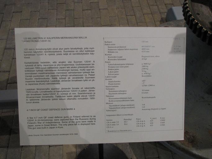 Keywords: Maneesi 120 41 A information plaque.JPG QF 4 7 /40 12 cm Mark IV gun in Maneesi Military Museum This gun was built in Kure Japan under license and later sold to Russian Empire Taken over by Finland and given the designation 120/41 A 120 mm 41 caliber model Armstrong This gun was used in the Järisevä coastal fort where it supported the Finnish defences at Mannerheim Line and was damaged during Winter War See also File Maneesi 120 41 A side 2 JPG right side view File Maneesi 120 41 A barrel JPG right side muzzle close-up view File Maneesi 120 41 A side JPG left side breech view File Maneesi 120 41 A rear JPG breech end view File Maneesi 120 41 A front JPG Muzzle view File Maneesi 120 41 A memorial plaque JPG memorial plaque fi Opastaulu 120/41 A eli 120 mm n 41 kaliiperin rannikkotykki mallia Armstrong Sotamuseon Maneesissa Englantilainen QF 4 7 /40 12 cm Mark IV valmistettu Kuressa Japanissa lisenssillä ja myöhemmin myyty Venäjän keisarikuntaan Tykki oli talvisodassa Järisevän rannikkolinnakkeella jossa se tuki Mannerheim-linjan puolustajia ja vaurioitui taisteluissa own MKFI 2010-05-13 60 8 45 09 N 24 59 20 61 E region FI QF 4 7 inch Gun Mk I - IV Coastal artillery in Finland Manege Military Museum Taken with Canon PowerShot SX10 IS Files by User MKFI