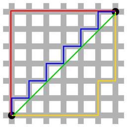 | Keywords: Manhattan distance.svg Figure illustrating Manhattan versus Euclidean distance The red blue and yellow lines all have the same length 12 whereas the green line has length <math>\sqrt 72 \approx 8 4853</math> Created by User Psychonaut with XFig 2006-04-25 User Psychonaut I release this image and its source code into the public domain Source code <pre> FIG 3 2 Landscape Center Metric A4 100 00 Single -2 1200 2 0 32 b2b2b2 1 3 0 1 0 0 40 -1 20 0 000 1 0 0000 3150 450 127 127 3150 450 3240 540 1 3 0 1 0 0 40 -1 20 0 000 1 0 0000 450 3150 127 127 450 3150 540 3240 2 1 0 10 32 32 50 -1 0 0 000 0 0 -1 0 0 2 450 3375 450 225 2 1 0 10 32 32 50 -1 0 0 000 0 0 -1 0 0 2 900 3375 900 225 2 1 0 10 32 32 50 -1 0 0 000 0 0 -1 0 0 2 1350 3375 1350 225 2 1 0 10 32 32 50 -1 0 0 000 0 0 -1 0 0 2 1800 3375 1800 225 2 1 0 10 32 32 50 -1 0 0 000 0 0 -1 0 0 2 2700 3375 2700 225 2 1 0 10 32 32 50 -1 0 0 000 0 0 -1 0 0 2 3150 3375 3150 225 2 1 0 10 32 32 50 -1 0 0 000 0 0 -1 0 0 2 2250 3375 2250 225 2 1 0 10 32 32 50 -1 0 0 000 0 0 -1 0 0 2 225 450 3375 450 2 1 0 10 32 32 50 -1 0 0 000 0 0 -1 0 0 2 225 900 3375 900 2 1 0 10 32 32 50 -1 0 0 000 0 0 -1 0 0 2 225 1350 3375 1350 2 1 0 10 32 32 50 -1 0 0 000 0 0 -1 0 0 2 225 1800 3375 1800 2 1 0 10 32 32 50 -1 0 0 000 0 0 -1 0 0 2 225 2250 3375 2250 2 1 0 10 32 32 50 -1 0 0 000 0 0 -1 0 0 2 225 2700 3375 2700 2 1 0 10 32 32 50 -1 0 0 000 0 0 -1 0 0 2 225 3150 3375 3150 2 1 0 2 4 4 30 -1 -1 0 000 0 0 -1 0 0 3 427 3150 427 427 3150 427 2 1 0 2 1 4 30 -1 -1 0 000 0 0 -1 0 0 13 450 3150 450 2700 900 2700 900 2250 1350 2250 1350 1800 1800 1800 1800 1350 2250 1350 2250 900 2700 900 2700 450 3150 450 2 1 0 2 31 4 30 -1 -1 0 000 0 0 -1 0 0 5 450 3150 2700 3150 2700 2250 3150 2250 3150 450 2 1 0 2 14 4 30 -1 -1 0 000 0 0 -1 0 0 2 495 3150 3150 495 </pre> taxicab distance |