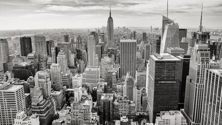 Keywords: manhattan empire state building new york city new york city skyscrapers high-rises buildings town metropole architecture black and white view skyline rooftops clouds towers