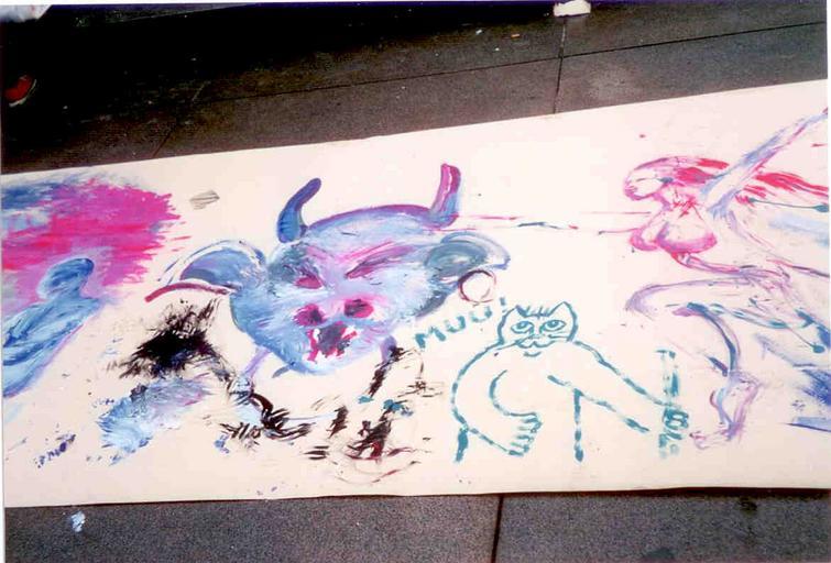 | Keywords: Manifestation des étudiants du liceo artistico et de l'Accademia Albertina di Belle Arti di Torino - 12 mai 1997 - 4.jpeg fr Sur une grande feuille de papier posée par terre devant le monument du duc d'Aoste piazza Castello à Turin les étudiants protestataires italiens ont fait des dessins dans le cadre de leur manifestation Celle-ci a intégré la protestation pour l'autorisation du Carnaval de Paris avec son Bœuf Gras Les Italiens l'ont représenté Basile a ajouté un chat qui fait meûh muu en italien Cette feuille a ensuite été placardée dans l'aula studenteszca de l'Accademia Albertina di Belle Arti de Turin own Basili 1997-05-12 Domaine public Manifestation des étudiants du Liceo artistico et de l'Accademia Albertina di Belle Arti di Torino le 12 mai 1997 à Turin Cc-zero |