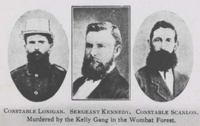 Keywords: Mansfield police murdered by Kelly Gang.jpg en Portraits of Constable Lonigan Sergeant Kennedy Constable Scanlon murdered by the Kelly gang in the Wombat forest 1878 photograph b w ; 12 0 x 16 5 cm 1878 http //nla gov au/nla pic-vn3796087 author other versions PD-old-70-1923 Uncategorized 2015 October 26 Uploaded with UploadWizard |
