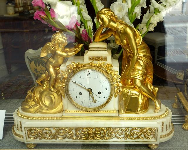 Keywords: Mantel clock with Cupid offering dove to a languishing woman, 7 day movement, dial marked Paris - Stockholm, Sweden - DSC00739.JPG en Mantel clock with Cupid offering dove to a languishing woman 7 day movement dial marked Paris - Stockholm Sweden This work is in the public domain because the artists died more than 100 years ago Displayed in an antique store's window 2014-09-16 own Daderot other versions PD-100 cc-zero Uploaded with UploadWizard Clocks in Stockholm 18th-century desk clocks |