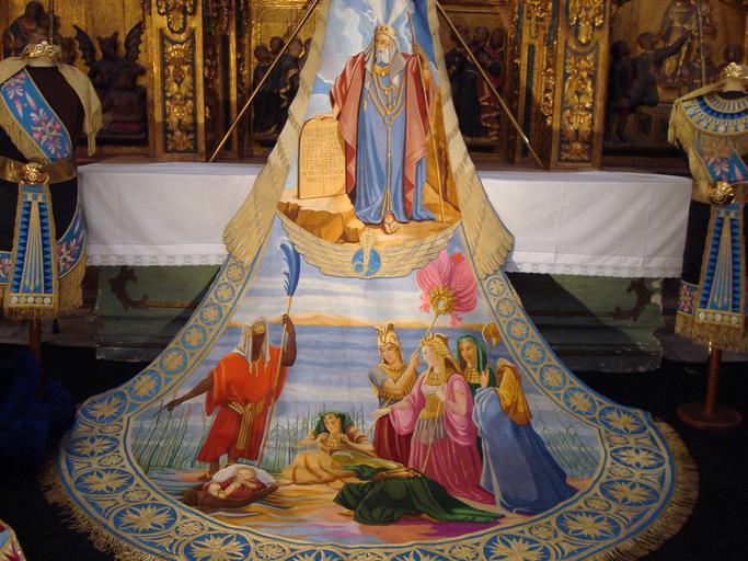 | Keywords: Manto Moisés en el Nilo Paso Azul.JPG Manto que representa a Moisés con las Tablas de la Ley y a Moisés siendo rescatado de las aguas del Nilo Manto bordado a mano por bordadoras lorquinas Semana Santa Lorca Own 2008-03-20 Awuachumele Holy Week in Lorca |