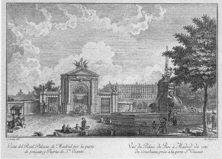 | Keywords: Manuel Alegre-Fuente y Puerta San Vicente-1900.JPG es J Gomez del t M Alegre sc t / Vista del Real Palacio de Madrid por la parte / de poniente y Puerta de S n Vicente / Vue du Palais du Roi à Madrid du coté / du couchant prise à la porte S t Vicent Cobre talla dulce 15 x 21 3 cm ~ 1790 engraving Colección de estampas del Museo de Historia de Madrid http //www memoriademadrid es/buscador php accion VerFicha id 5333 num_id 6 num_total 429 Base del sitio Memoria de Madrid other versions PD-old-100 Manuel Alegre engraver José Gómez de Navia 18th-century engravings Mascarones Fountain Madrid Puerta de San Vicente Madrid Engravings of fountains in Madrid |