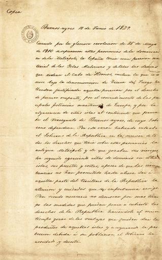 | Keywords: Manuscrito del Decreto que instituye Comandancia Militar en las Malvinas 01.jpg es Copia manuscrita del Decreto que instituye una Comandancia Militar en las Islas Malvinas y costas adyacentes Buenos Aires 10 de junio de 1829 Archivo General de la Nación Argentina Documentos escritos Fondo Luis Vernet Documento 28 Sala VII Nº 127 Transcripción Cuando por la gloriosa revolución de 25 de Mayo de 1810 se separaron estas provincias de la dominación de la Metrópoli la España tenía una porción material de las Islas Malvinas y de todas las demás que rodean el Cabo de Hornos incluso la que se conoce bajo la denominación de Tierra del Fuego hallándose justificada aquella porción por el derecho de primer ocupante por el convencimiento de las principales potencias marítimas de Europa y por la adyacencia de estas Islas al continente que formaba el Virreinato de Buenos Aires de cuyo Soberano dependían Por esta razón habiendo entrado el Gobierno de la República en la sucesión de todos los derechos que tenía sobre estas provincias la antigua Metrópoli y de que gozaban sus virreyes ha seguido ejerciendo actos de dominio en dichas islas sus puertos y costas; a pesar de que las circunstancias no han permitido hasta ahora dar a aquella parte del territorio de la República la atención y cuidados que su importancia exige Pero siendo necesario no demorar por más tiempo las medidas que puedan poner a cubierto los derechos de la República haciéndole al mismo tiempo gozar de las ventajas que pueden dar los productos de aquellas islas y asegurando la protección debida a su población el Gobierno ha acordado decretar Artículo 1º Las Islas Malvinas y las adyacentes al Cabo de Hornos en el Mar Atlántico serán regidas por un comandante político y militar nombrado inmediatamente por el Gobierno de la República Artículo 2º La residencia del comandante político y militar será en la Isla de la Soledad y en ella se establecerá una batería bajo el pabellón de la República Artículo 3º El comandante político y militar hará observar por la población de dichas islas las leyes de la República y cuidará en sus cartas de la ejecución de los reglamentos sobre pesca de anfibios Artículo 4º Comuníquese y publíquese Martín Rodríguez Salvador María del Carril Está conforme Francisco Pico 1829-06-10 Archivo General de la Nación Argentina Documentos escritos Fondo Luis Vernet Documento 28 Sala VII Nº 127 Gobierno de Buenos Aires other versions Custom license marker 2015 09 13 PD-Old 1829 in Argentina Comandancia política y militar de las Islas Malvinas Luis Vernet Cape Horn 1829 documents Uploaded with UploadWizard Archivo General de la Nación Argentina |