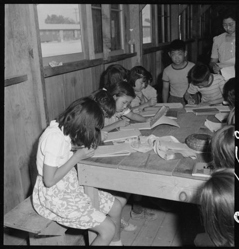 Keywords: Manzanar Relocation Center, Manzanar, California. These young evacuees are attending the first elem . . . - NARA - 537956.jpg Scope and content The full caption for this photograph reads Manzanar Relocation Center Manzanar California These young evacuees are attending the first elementary school at this War Relocation Authority center There are six grades with volunteer teachers and voluntary attendance General notes 537956 Local identifier 210-G-C658 Department of the Interior War Relocation Authority 02/16/1944 - 06/30/1946 NARA-Author Lange Dorothea 1895-1965 Photographer 1372774 <br /> Still Picture Records Section Special Media Archives Services Division NWCS-S National Archives at College Park 8601 Adelphi Road College Park MD 20740-6001 1942-07-01 Record group Record Group 210 Records of the War Relocation Authority 1941 - 1989 Record group ARC 537 Central Photographic File of the War Relocation Authority compiled 1942 - 1945 Series ARC 536000 File unit File unit ARC Variant control numbers NAIL Control Number NWDNS-210-G-C658 Other versions <gallery> File Manzanar_Relocation_Center _Manzanar _California _These_young_evacuees_are_attending_the_first_elem_ _ _ _-_NARA_-_537956 tif tif File Manzanar_Relocation_Center _Manzanar _California _These_young_evacuees_are_attending_the_first_elem_ _ _ _-_NARA_-_537956 jpg jpg </gallery> NARA-cooperation PD-USGov Photographs by Dorothea Lange of Manzanar War Relocation Center