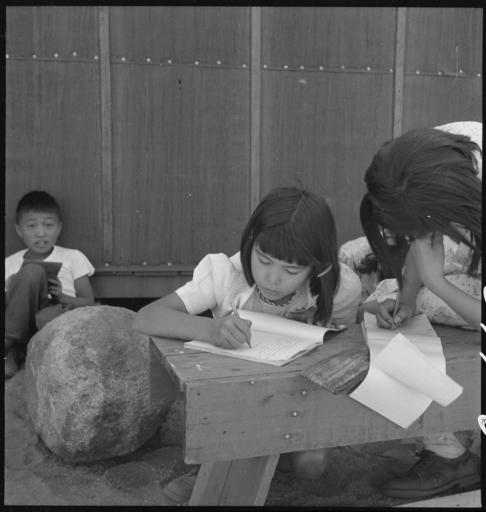 | Keywords: Manzanar Relocation Center, Manzanar, California. An elementary school has been established with vo . . . - NARA - 537959.jpg Scope and content The full caption for this photograph reads Manzanar Relocation Center Manzanar California An elementary school has been established with volunteer evacuee teachers most of whom are college graduates Attendance at this time is voluntary No school equipment is as yet available and available tables and benches are used Classes are often held outside in the shade of the barrack building General notes 537959 Local identifier 210-G-C662 Department of the Interior War Relocation Authority 02/16/1944 - 06/30/1946 NARA-Author Lange Dorothea 1895-1965 Photographer 1372774 <br /> Still Picture Records Section Special Media Archives Services Division NWCS-S National Archives at College Park 8601 Adelphi Road College Park MD 20740-6001 1942-07-01 Record group Record Group 210 Records of the War Relocation Authority 1941 - 1989 Record group ARC 537 Central Photographic File of the War Relocation Authority compiled 1942 - 1945 Series ARC 536000 File unit File unit ARC Variant control numbers NAIL Control Number NWDNS-210-G-C662 Other versions <gallery> File Manzanar_Relocation_Center _Manzanar _California _An_elementary_school_has_been_established_with_vo_ _ _ _-_NARA_-_537959 tif tif File Manzanar_Relocation_Center _Manzanar _California _An_elementary_school_has_been_established_with_vo_ _ _ _-_NARA_-_537959 jpg jpg </gallery> NARA-cooperation PD-USGov Photographs by Dorothea Lange of Manzanar War Relocation Center |