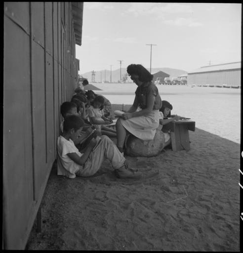 | Keywords: Manzanar Relocation Center, Manzanar, California. An elementary school with voluntary evacuee atten . . . - NARA - 537966.jpg Scope and content The full caption for this photograph reads Manzanar Relocation Center Manzanar California An elementary school with voluntary evacuee attendance has been established with volunteer evacuee teachers most of whom are college graduates No school equipment is as yet obtainable and available tables and benches are used However classes are often held in the shade of the barrack building at this War Relocation Authority center General notes 537966 Local identifier 210-G-C669 Department of the Interior War Relocation Authority 02/16/1944 - 06/30/1946 NARA-Author Lange Dorothea 1895-1965 Photographer 1372774 <br /> Still Picture Records Section Special Media Archives Services Division NWCS-S National Archives at College Park 8601 Adelphi Road College Park MD 20740-6001 1942-07-01 Record group Record Group 210 Records of the War Relocation Authority 1941 - 1989 Record group ARC 537 Central Photographic File of the War Relocation Authority compiled 1942 - 1945 Series ARC 536000 File unit File unit ARC Variant control numbers NAIL Control Number NWDNS-210-G-C669 Other versions <gallery> File Manzanar_Relocation_Center _Manzanar _California _An_elementary_school_with_voluntary_evacuee_atten_ _ _ _-_NARA_-_537966 tif tif File Manzanar_Relocation_Center _Manzanar _California _An_elementary_school_with_voluntary_evacuee_atten_ _ _ _-_NARA_-_537966 jpg jpg </gallery> NARA-cooperation PD-USGov Photographs by Dorothea Lange of Manzanar War Relocation Center Children of the United States Manzanar People of California Manzanar Schools in California Manzanar Classrooms in the United States Manzanar NARA images of Inyo County California Black and white photographs of children Manzanar Black and white photographs of classrooms Manzanar Black and white photographs of California |