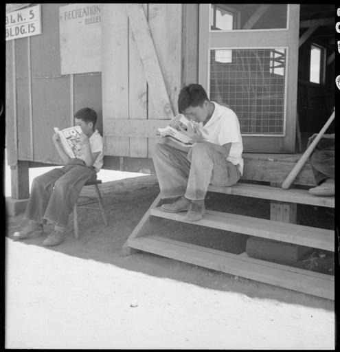 | Keywords: Manzanar Relocation Center, Manzanar, California. Evacuee boys of Japanese ancestry at entrance of . . . - NARA - 538075.jpg Scope and content The full caption for this photograph reads Manzanar Relocation Center Manzanar California Evacuee boys of Japanese ancestry at entrance of Relocation Hall reading Funnies General notes 538075 Local identifier 210-G-C782 Department of the Interior War Relocation Authority 02/16/1944 - 06/30/1946 NARA-Author Lange Dorothea 1895-1965 Photographer 1372774 <br /> Still Picture Records Section Special Media Archives Services Division NWCS-S National Archives at College Park 8601 Adelphi Road College Park MD 20740-6001 1942-07-01 Record group Record Group 210 Records of the War Relocation Authority 1941 - 1989 Record group ARC 537 Central Photographic File of the War Relocation Authority compiled 1942 - 1945 Series ARC 536000 File unit File unit ARC Variant control numbers NAIL Control Number NWDNS-210-G-C782 Other versions <gallery> File Manzanar_Relocation_Center _Manzanar _California _Evacuee_boys_of_Japanese_ancestry_at_entrance_of_ _ _ _-_NARA_-_538075 tif tif File Manzanar_Relocation_Center _Manzanar _California _Evacuee_boys_of_Japanese_ancestry_at_entrance_of_ _ _ _-_NARA_-_538075 jpg jpg </gallery> NARA-cooperation PD-USGov Photographs by Dorothea Lange of Manzanar War Relocation Center |