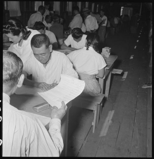 | Keywords: Manzanar Relocation Center, Manzanar, California. Part of a class under the Adult Education Program . . . - NARA - 538094.jpg Scope and content The full caption for this photograph reads Manzanar Relocation Center Manzanar California Part of a class under the Adult Education Program at this War Relocation Authority center It is composed of Issei and Kibei evacuees who are studying the Ideals of American Citizenship and the English language with which they are unfamiliar There are 18 such classes each averaging 20 volunteer members and conducted by volunteer instructors General notes 538094 Local identifier 210-G-C801 Department of the Interior War Relocation Authority 02/16/1944 - 06/30/1946 NARA-Author Lange Dorothea 1895-1965 Photographer 1372774 <br /> Still Picture Records Section Special Media Archives Services Division NWCS-S National Archives at College Park 8601 Adelphi Road College Park MD 20740-6001 1942-07-03 Record group Record Group 210 Records of the War Relocation Authority 1941 - 1989 Record group ARC 537 Central Photographic File of the War Relocation Authority compiled 1942 - 1945 Series ARC 536000 File unit File unit ARC Variant control numbers NAIL Control Number NWDNS-210-G-C801 Other versions <gallery> File Manzanar_Relocation_Center _Manzanar _California _Part_of_a_class_under_the_Adult_Education_Program_ _ _ _-_NARA_-_538094 tif tif File Manzanar_Relocation_Center _Manzanar _California _Part_of_a_class_under_the_Adult_Education_Program_ _ _ _-_NARA_-_538094 jpg jpg </gallery> NARA-cooperation PD-USGov Photographs by Dorothea Lange of Manzanar War Relocation Center |