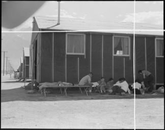 Keywords: Manzanar Relocation Center, Manzanar, California. Evacuees at this War Relocation Authority center . . . - NARA - 538160.jpg Scope and content The full caption for this photograph reads Manzanar Relocation Center Manzanar California Evacuees at this War Relocation Authority center relaxing in the shade of their barrack apartment General notes 538160 Local identifier 210-G-C875 Department of the Interior War Relocation Authority 02/16/1944 - 06/30/1946 NARA-Author Lange Dorothea 1895-1965 Photographer 1372774 <br /> Still Picture Records Section Special Media Archives Services Division NWCS-S National Archives at College Park 8601 Adelphi Road College Park MD 20740-6001 1942-07-03 Record group Record Group 210 Records of the War Relocation Authority 1941 - 1989 Record group ARC 537 Central Photographic File of the War Relocation Authority compiled 1942 - 1945 Series ARC 536000 File unit File unit ARC Variant control numbers NAIL Control Number NWDNS-210-G-C875 Other versions <gallery> File Manzanar_Relocation_Center _Manzanar _California _Evacuees_at_this_War_Relocation_Authority_center_ _ _ _-_NARA_-_538160 tif tif File Manzanar_Relocation_Center _Manzanar _California _Evacuees_at_this_War_Relocation_Authority_center_ _ _ _-_NARA_-_538160 jpg jpg </gallery> NARA-cooperation PD-USGov Photographs by Dorothea Lange of Manzanar War Relocation Center Wooden houses in Inyo County California Manzanar Houses in California built in 1942 Manzanar NARA images of Inyo County California Black and white photographs of residential buildings Manzanar Black and white photographs of California