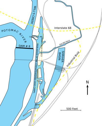 | Keywords: Map of Chesapeake and Ohio Canal Terminus at Cumberland Maryland in mid 1890s.svg en Map of the end of the Chesapeake and Ohio Canal in the mid 1890's at Cumberland Maryland Yellow dotted lines indicate modern items e g approximate location of Canal Basin in 2013 Interstate 68 and Industrial Bvld Also note some railroad tracks are missing particularly the Western MD railroad as well as the indications for the towpath own Bonnachoven Chesapeake Ohio Canal National Historical Park Cc-zero |