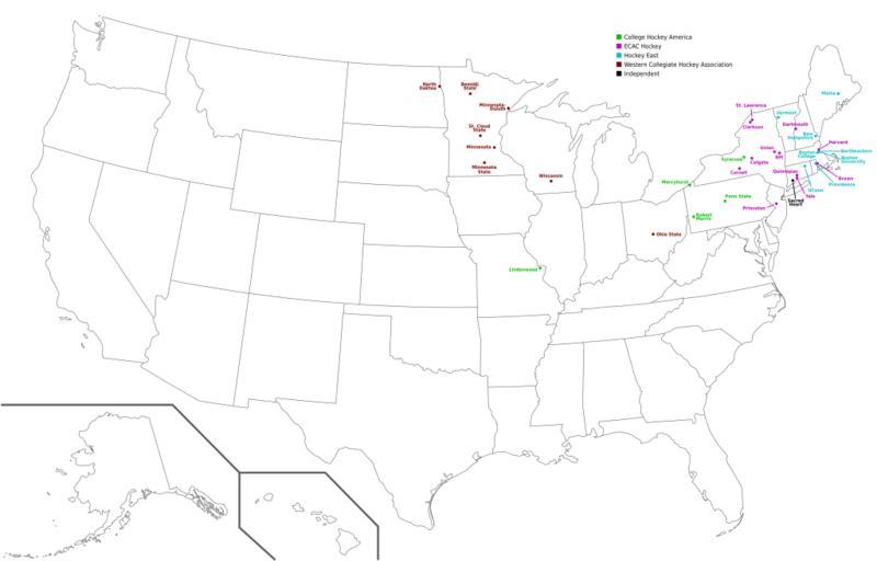 Keywords: Map - College Hockey - all women's D-I locations.svg NCAA Division I women's college ice hockey teams College Hockey America green ECAC Hockey magenta Hockey East cyan Western Collegiate Hockey Association maroon Independents black own LtPowers 2010-04-29 en File Chw PNG outdated SVG maps of the United States College ice hockey maps of the United States |