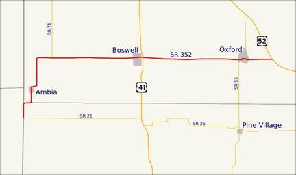 | Keywords: Map of Indiana State Road 352.svg This is a map which shows the route of Indiana State Road 352 in the United States My own work using freely-available shape data and custom-written MapScript applications 2008-03-04 Omnedon Road maps of Indiana SR352 |