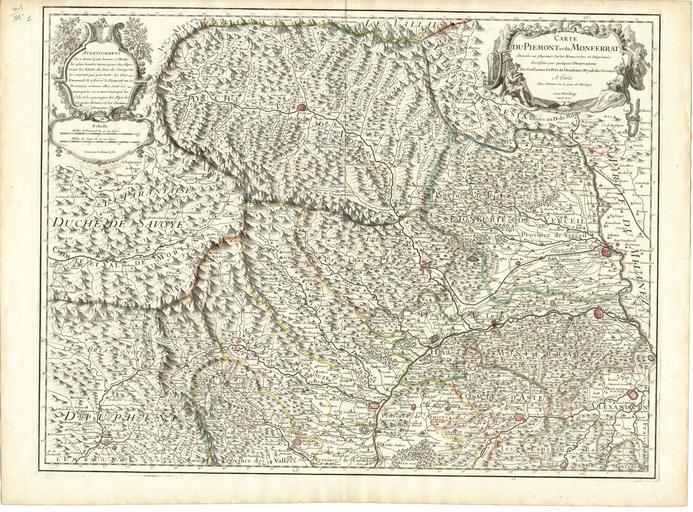 Keywords: Map italy monferrato CG 13 CARTE DU PIEMONT ET DU MONFERRAT Dressée sur plusieurs Cartes Manuscrits ou Imprimées.jpg CARTE DU PIEMONT ET DU MONFERRAT / Dressée sur plusieurs Cartes Manuscrits ou Imprimées/ Rectifiées par quelques Observations / Par Guillaume de l ™Isle de l ™Ac Royale des Sciences/ A Paris/ Chez l ™Auteur sur le Quai de l ™Horloge/ Avec Privilege/ Avril 1707 Gravé par Liebaux fils Incisione su rame mm 523 X 713 colorata a mano Scala in miglia piemontesi e genovesi Nel cartiglio in alto a sinistra si avvisa della ripartizione del Piemonte in province decisa dal duca Emanuele II dei valichi alpini e delle strade romane ancora praticabili own scan 2014-05-12 15 59 47 2014061810021504 PD-old-100 1707 maps |