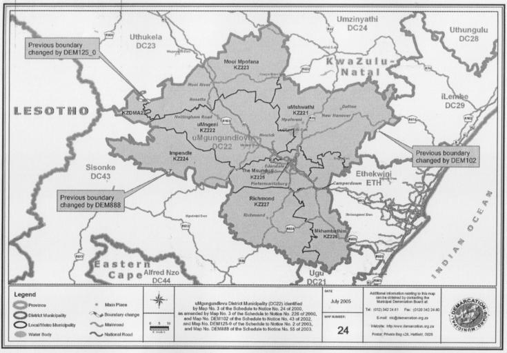 | Keywords: Map No. 24 of Schedule 2 to Notice 1998 of 2005.png Notice 1998 of 2005 Depicts the boundaries of the uMgungundlovu District Municipality File Notice 1998 of 2005 djvu Municipal Demarcation Board of South Africa 2005-10-31 PD-South-Africa-exempt Maps of KwaZulu-Natal municipalities with 2006 borders Notice 1998 of 2005 |
