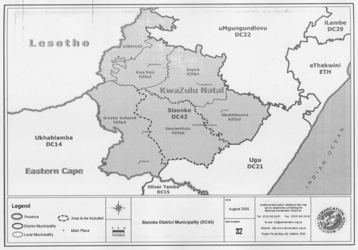 | Keywords: Map No. 32 of Schedule 2 to Notice 1998 of 2005.png Notice 1998 of 2005 Depicts the boundaries of the Sisonke District Municipality File Notice 1998 of 2005 djvu Municipal Demarcation Board of South Africa 2005-10-31 PD-South-Africa-exempt Maps of KwaZulu-Natal municipalities with 2006 borders Notice 1998 of 2005 |