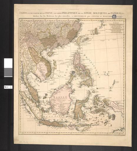 | Keywords: Map of a Part of China, the Philippine Islands, the Isles of Sunda, the Moluccas, the Papuans WDL460.png Artwork ru Ка та части Китая Филиппинских ост овов ост овов Сунда олуккских ост овов Папуасских ост овов fr Carte d'une partie de la Chine des Philippines des îles Sunda des Moluques des Papous en Map of a Part of China the Philippine Islands the Isles of Sunda the Moluccas the Papuans zh 包括中国 菲律宾群岛 巽他群岛 摩鹿加群岛以及巴布亚部分 区 内的 图 pt Mapa de uma Parte da China as Ilhas Filipinas as Ilhas de Sunda as Molucas os Papuans ar خريطة لجزء من الصين، وجزر الفلبين، وجزر ساندا، والمولوكاس، وبابوا ru Эта ка та юго-восточной части Азии и некото ых егионов Китая составленная в XVIII веке была опубликована в Амсте даме фи мой Covens and Mortier Пите о тье 1661-1711 гг основал п оцветающую компанию кото ая специализи овалась на выпуске новых изданий атласов Алексиса Юбе а Жайо иколя де Фе а и д угих ф анцузских ка тог афов о тье также п иоб ел все ка ты голландского ка тог афа Ф еде ика де Вита и п ава на их пе еиздание После сме ти о тье дела фи мы пе ешли к его сыну Ко нелису 1699-1783 гг В 1721 году Ко нелис женился на сест е Иоханнеса Ковенса 1697-1774 гг В том же году Ко нелис о тье и его шу ин основали фи му Covens and Mortier Ка ты и атласы этой фи мы входили в число лучших ка тог афических изданий XVIII века азвание этой ка ты п иведено на ф анцузском языке но геог афические названия и п имечания были пе еведены на голландский язык <br>Индокитай fr Cette carte du 18ème siècle du Sud-Est asiatique et de certaines parties de la Chine a été publiée à Amsterdam par la société de Covens et Mortier Pieter Mortier 1661-1711 construisit une entreprise qui prospéra par la publication de nouvelles éditions d'atlas d'Alexis Hubert Jaillot Nicolas de Fer et d'autres cartographes français Mortier acquit également le stock du cartographe hollandais Frederik de Wit ainsi que le droit de reproduire ses cartes Lorsque Mortier décéda l'entreprise passa à son fils Cornelis 1699-1783 En 1721 Cornelis épousa la sœur de Johannes Covens 1697-1774 La même année Cornelis Mortier et son beau-frère fondèrent la société Covens et Mortier Leurs cartes et leurs atlas étaient les publications cartographiques les plus connues du siècle Le titre de cette carte est en français mais un grand nombre de noms de lieu et les notes ont été traduits en néerlandais <br>Indochine en This 18th-century map of southeast Asia and parts of China was published in Amsterdam by the firm of Covens and Mortier Pieter Mortier 1661-1711 built up a business that prospered by publishing new editions of atlases by Alexis Hubert Jaillot Nicolas de Fer and other French mapmakers Mortier also acquired the stock of the Dutch mapmaker Frederik de Wit and the right to reprint his maps When Mortier died the business passed to his son Cornelis 1699-1783 In 1721 Cornelis married the sister of Johannes Covens 1697-1774 In the same year Cornelis Mortier and his brother-in-law founded the firm of Covens and Mortier Their maps and atlases were among the best known cartographic publications of the century The title of this map is in French but many of the place names and notes have been translated into Dutch <br>Indochina zh 这幅 18 世纪的 南亚和中国部分 区的 图是由 Covens and Mortier 公司 阿姆斯特丹出版的 Pieter Mortier (1661-1711 年)成立了 家公司,这家公司 出版 Alexis Hubert Jaillot Nicolas de Fer 及其他法国制图师的新版 图集 蒸蒸日上 Mortier 还获得了荷兰制图师 Frederik de Wit 绘制的 图以及再次印刷这些 图的 利 Mortier 去世后,该公司交由他的儿子 Cornelis(1699-1783 年)经营 1721 年,Cornelis 与 Johannes Covens(1697-1774 年)的妹妹(或姐姐)结婚 同年,Cornelis Mortier 和其姐夫(或妹夫)共同创建了 Covens and Mortier 公司 这家公司 出版的 图和 图集位居该世纪 著名的 图出版物行列 这幅 图的标题采用的是法语,但是其中的很多 名和说明都已经被翻译成了荷兰语 <br>印度支那 pt Este mapa do século XVIII do Sudeste Asiático e de partes da China foi públicado em Amsterdam pela empresa de Covens e Mortier Pieter Mortier 1661-1711 construiu um negócio que prosperou com a publicação das novas edições dos atlas de Alexis Hubert Jaillot Nicolas de Fer e outros cartógrafos franceses Mortier adquiriu também o estoque do cartógrafo holandês Frederik de Wit e o direito de reimprimir seus mapas Com a morte de Mortier a empresa passou para seu filho Cornelis 1699-1783 Em 1721 Cornelis casou-se com a irmã de Johannes Covens 1697-1774 No mesmo ano Cornelis Mortier e seu cunhado fundaram a empresa de Covens e Mortier Seus mapas e atlas estavam entre as publicações cartográficas mais conhecidas do século O título deste mapa está em francês mas muitos dos topônimos e observações foram traduzidos para o holandês <br>Indochina ar نشرت هذه الخريطة من القرن الثامن عشر لجنوب شرق آسيا وأجزاء من الصين شركة كوفنز ومورتيير في أمستردام أسس بيتر مورتيير 1661-1711 منشأة ازدهرت من خ