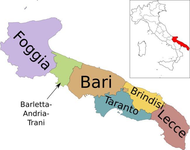 | View Original: | Map of region of Apulia, Italy, with provinces-it.svg (4169x3287) | |||
