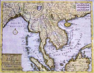 Keywords: Map shows Indochina and Southeast Asia 1750.jpg en Hand colored copper engraved map titled Nvoua Carta dell' India di la' del Fiume Ganges overo di Malacca Siam Cambodia Chiampa Kochinchina Laos Pegu Ava c Map shows Indochina and Southeast Asia with the Bay of Bengal Singapore Sumatra Borneo and other cities Map published in Amsterdam by Isac Tirion 1750 http //www printsoldandrare com/asia/233asia jpg Isac Tirion 1750 PD-Art-100 Old maps of Southeast Asia 1750 maps |