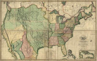 | Keywords: Map of the United States of America- With the Contiguous British and Spanish Possessions, 1816 WDL9561.png Artwork ru елиш Джон 1771-1822 гг fr Melish John 1771-1822 en Melish John 1771-1822 zh 约翰·梅里 ,1771-1822 年 pt Melish John 1771-1822 ar جون ميليش، 1771-1822 es Melish John 1771-1822 ru Ка та Соединенных Штатов Аме ики с указанием пог аничных б итанских и испанских владений 1816 г fr Carte des États-Unis d'Amérique avec les possessions britanniques et espagnoles limitrophes 1816 en Map of the United States of America With the Contiguous British and Spanish Possessions 1816 zh 美利 合众国 图:附带邻近的英国和西班牙领 ,1816 年 pt Mapa dos Estados Unidos da América com as possessões vizinhas britânica e espanhola de 1816 ar خريطة الولايات المتحدة الأمريكية تُظهر الأملاك البريطانية والإسبانية المجاورة، 1816 ru а этой ка те 1816 г составленной Джоном елишем 1771 1822 гг Соединенные Штаты Аме ики впе вые изоб ажены как континентальное госуда ство п ости ающееся от Атлантического океана до Тихого елиш был шотландцем кото ый много путешествовал по Соединенным Штатам Аме ики в 1806 1807 гг В 1809 г он ве нулся в Аме ику и навсегда поселился в Филадельфии где еклами овал себя как геог аф и издатель и отк ыл пе вую в США фи му занимавшуюся изданием ка т В соп оводительной б ошю е к этой ка те елиш пояснил что пе воначально он наме евался закончить ка ту на Великом континентальном азделе Он ешил асши ить ка ту до Тихого океана так как часть этой те ито ии бесспо но п инадлежит Соединенным Штатам Аме ики В 1816 г значительная часть западной те ито ии сов еменных Соединенных Штатов Аме ики находилась под испанским конт олем но молодая еспублика заявила о своих п итязаниях на те ито ию О егон Эти п итязания были подк еплены экспедицией Льюиса и Кла ка кото ая достигла Тихого океана в 1805 г и цепью ук епленных пунктов меховой то говли нью-йо кского п едп инимателя Джона Джекоба Асто а кото ая п ости алась от еки иссу и до устья еки Колумбия Ка та елиша п иоб ела ши окую известность и использовалась п и ведении пе егово ов с ев опейскими властями о будущих г аницах Соединенных Штатов Аме ики <br>Великоб итания Колонии; Испания Колонии fr Cette carte de John Melish 1771-1822 datant de 1816 est la première à représenter les États-Unis comme État continental s'étendant de l'océan Atlantique au Pacifique Melish était un Écossais qui voyagea grandement dans les États-Unis entre 1806 et 1807 En 1809 il retourna s'installer définitivement à Philadelphie où il se fit connaître en tant que « géographe et éditeur » et fonda la première société d'édition américaine consacrée à la publication de cartes Dans une brochure accompagnant cette carte Melish explique qu'à l'origine il pensait la terminer à la ligne continentale de partage des eaux Il décida de l'étendre jusqu'à l'océan Pacifique car « une partie de ce territoire appartient indéniablement aux États-Unis » En 1816 une large portion de la partie occidentale des États-Unis actuels était sous contrôle espagnol mais la jeune république revendiquait le territoire orégonais Cette revendication était renforcée par l'expédition de Lewis et Clark qui avait atteint le Pacifique en 1805 et par la chaîne de postes fortifiés de commerce de fourrure du commerçant new-yorkais John Jacob Astor qui s'étendait de la rivière Missouri à l'embouchure du fleuve Columbia La carte de Melish devint célèbre et fut utilisée dans la négociation de traités avec les pouvoirs européens concernant les futures frontières des États-Unis <br>Grande-Bretagne--Colonies; Espagne--Colonies en This 1816 map by John Melish 1771 1822 is the first to show the United States as a continental state stretching from the Atlantic Ocean to the Pacific Melish was a Scot who traveled extensively in the United States in 1806 7 In 1809 he returned to America and settled permanently in Philadelphia where he advertised himself as Geographer and Publisher and set up the first U S firm dedicated to map publishing In an accompanying booklet to this map Melish explained that he initially intended to end his map at the Continental Divide He decided to extend it to the Pacific Ocean for part of this territory unquestionably belongs to the United States In 1816 much of the western part of the present-day United States was under Spanish control but the young republic had staked a claim to the Oregon Territory This claim was buttressed by the Lewis and Clark expedition which had reached the Pacific in 1805 and by the New York merchant John Jacob Astor s chain of fortified fur-trading posts extending from the Missouri River to the mouth of the Columbia River Melish s map became well known and was used in treaty negotiations wit