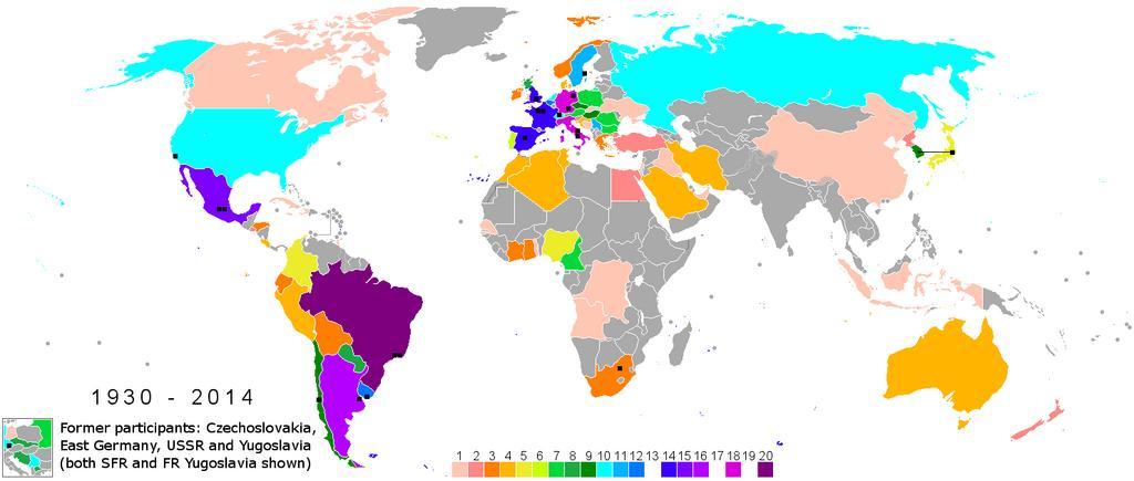 Keywords: Map World Cup appearances 2014 (enwiki).png Map_World_Cup_appearances 1930-2014 own 2013-11-21 Dufo Image from German wikipedia The map shows the number of final round participation of the respective countries with the FIFA world championship colors indicated as down and the host countries black squares 7E007E 20 “ “ Brazil 19 no country D900D9 18 “ “ Italy ¢ Germany incl West Germany 1954-1990 17 no country B400FF 16 “ “ Argentina 7E00FF 15 “ “ Mexico 3A00FF 14 “ “ England ¢ France ¢ Spain 13 no country 0077FF 12 “ “ Belgium ¢ Uruguay 00B4FF 11 “ “ Sweden ¢ Serbia incl Yugoslavia 1930-1990 Serbia and Montenegro 1994-2006 01FFFF 10 “ “ Netherlands ¢ Switzerland ¢ United States ¢ Russia incl U S S R 1930-1990 008800 9 “ “ “ Chile ¢ Hungary ¢ South Korea ¢ Czech Republic incl Czechoslovakia 1930-1990 1BA943 8 “ “ “ Paraguay ¢ Scotland 00D93A 7 “ “ “ Austria ¢ Bulgaria ¢ Cameroon ¢ Poland ¢ Romainia C6FF00 6 “ “ “ Portugal ECEC2A 5 “ “ “ Colombia ¢ Japan ¢ Nigeria FFB400 4 “ “ “ Algeria ¢ Australia ¢ Croatia ¢ Costa Rica ¢ Denmark ¢ Iran ¢ Morocco ¢ Peru ¢ Sauda Arabia ¢ Tunisia FF7E00 3 “ “ “ Bolivia ¢ Ecuador ¢ Ghana ¢ Greece ¢ Honduras ¢ Ivory Coast ¢ Republic of Ireland ¢ Northern Ireland ¢ Norway ¢ South Africa FF8787 2 “ “ “ Egypt ¢ El Salvador ¢ New Zealand ¢ North Korea ¢ Slovenia ¢ Turkey FFC6B4 1 “ “ “ Angola ¢ Bosnia and Herzegovina ¢ Canada ¢ China ¢ DR Congo Zaire ¢ Cuba ¢ East Germany ¢ Haiti ¢ Indonesia ¢ Iraq ¢ Israel ¢ Jamaica ¢ Kuwait ¢ Senegal ¢ Slovakia ¢ Togo ¢ Trinidad and Tobago ¢ Ukraine ¢ United Arab Emirates ¢ Wales ababab never qualified to the final round The small diagram shows the former countries USSR Yugoslavia Czechoslovakia and GDR Alternative map Only World Cups from 1930 to 2010 Nur Weltmeisterschaften von 1930 bis 2010 File World_cup_appearances_2010 png <br> 250px <br> File Map World Cup appearances enwiki png <br> 250px All World Cups from 1930 to 2014 Alle Weltmeisterschaften von 1930 bis 2014 File World_cup_appearances_2014 png <br> 250px Dufo World cup maps ImageNote 1 539 124 58 54 1357 628 2 France ImageNoteEnd 1 ImageNote 2 578 144 54 63 1357 628 2 Italy ImageNoteEnd 2 ImageNote 3 241 324 183 212 1357 628 2 Brazil ImageNoteEnd 3 ImageNote 4 606 455 92 71 1357 628 2 South Africa ImageNoteEnd 4 ImageNote 5 1180 151 83 109 1357 628 2 South Korea and Japan co hosted FIFA World Cup 2002 ImageNoteEnd 5 ImageNote 8 679 128 61 50 1480 628 2 France ImageNoteEnd 8 ImageNote 9 383 333 174 182 1480 628 2 Brazil ImageNoteEnd 9 ImageNote 10 401 439 68 176 1480 628 2 Chile ImageNoteEnd 10 ImageNote 11 411 456 78 161 1480 628 2 Argentina ImageNoteEnd 11 ImageNote 12 457 489 35 39 1480 628 2 Uruguay ImageNoteEnd 12 ImageNote 13 226 209 122 93 1480 628 2 Mexico ImageNoteEnd 13 ImageNote 14 105 44 350 211 1480 628 2 The Untied States of America ImageNoteEnd 14 ImageNote 15 753 454 93 98 1480 628 2 South Africa ImageNoteEnd 15 ImageNote 16 660 157 61 56 1480 628 2 Spain ImageNoteEnd 16 ImageNote 17 722 143 22 20 1480 628 2 Switzerland ImageNoteEnd 17 ImageNote 18 679 107 35 39 1480 628 2 England ImageNoteEnd 18 ImageNote 19 720 146 57 57 1480 628 2 Italy ImageNoteEnd 19 ImageNote 20 736 46 48 72 1480 628 2 Sweeden ImageNoteEnd 20 ImageNote 21 720 111 41 44 1480 628 2 Germany ImageNoteEnd 21 ImageNote 22 1180 144 89 115 1480 628 2 Japan and South Korea co-hosted in the 2002 FIFA World Cup ImageNoteEnd 22 FIFA World Cup Association football maps of the world