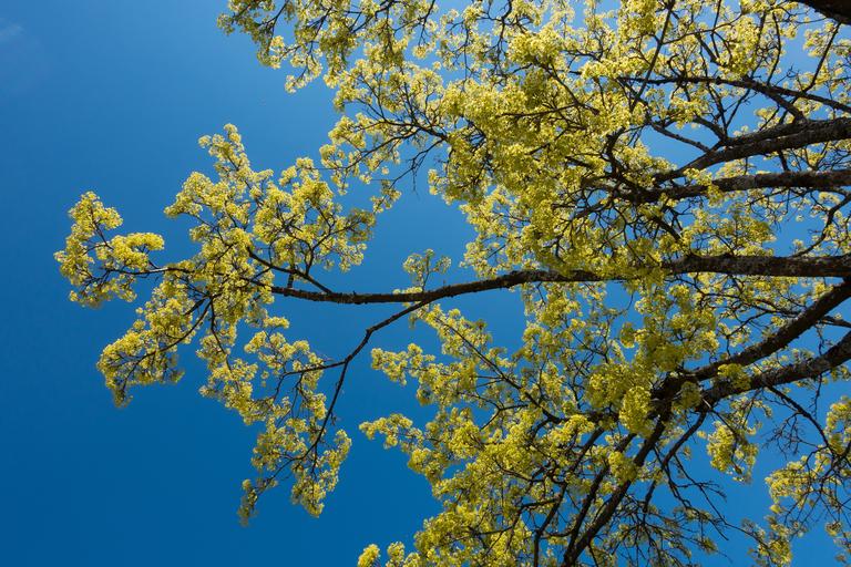 Keywords: maple acer platanoides blossomed inflorescence blossom bloom green yellow green spring sky blue