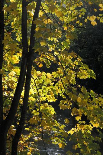 Keywords: maple autumn color tree leaves yellow light shadow back light log tribe sun