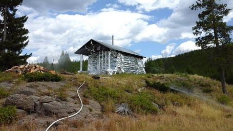Keywords: yellowstone national park yellowstonenationalpark maple fire maplefire wildland fire wildlandfire outdoor serene To protect the Cougar Creek patrol cabin, it has been wrapped in aluminized structure wrap.The material is similar to the fire shields that firefighters carry with them, and it reflects up to 95 percent of radiant heat NPS Photo To protect the Cougar Creek patrol cabin, it has been wrapped in aluminized structure wrap.The material is similar to the fire shields that firefighters carry with them, and it reflects up to 95 percent of radiant heat NPS Photo