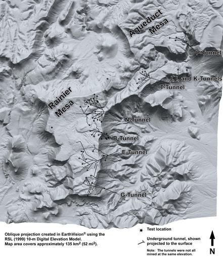 | Keywords: Maps of tunnels in Rainier and Aqueduct mesas.jpg en Maps of tunnels in Rainier and Aqueduct mesas Rainier Mesa CAU Infiltration Model using INFILv3 LA-UR-12-22984 Daniel G Levitt and Edward M Kwicklis Earth and Environmental Sciences Division Los Alamos National Laboratory other versions PD-USGov Rainier Mesa Maps of the Nevada National Security Site |